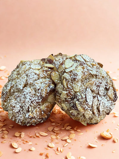 Savor the tropical twist of our Almond Guava Cookie. A buttery almond crumb is blended with guava and rolled into the dough, then topped with toasted almonds and a light sprinkle of powdered sugar for the perfect balance of nutty, fruity, and sweet in every bite.
